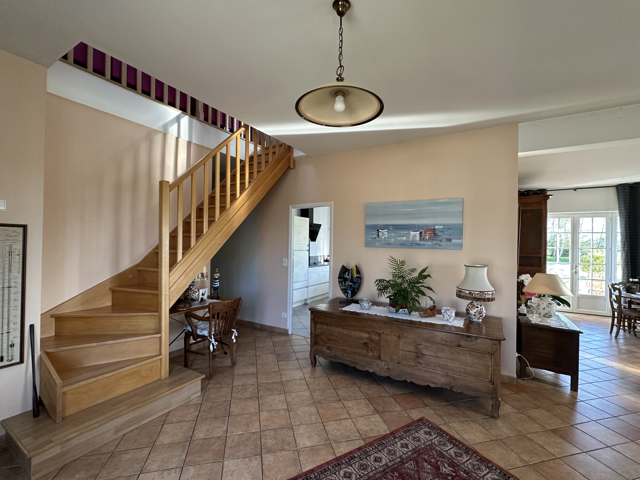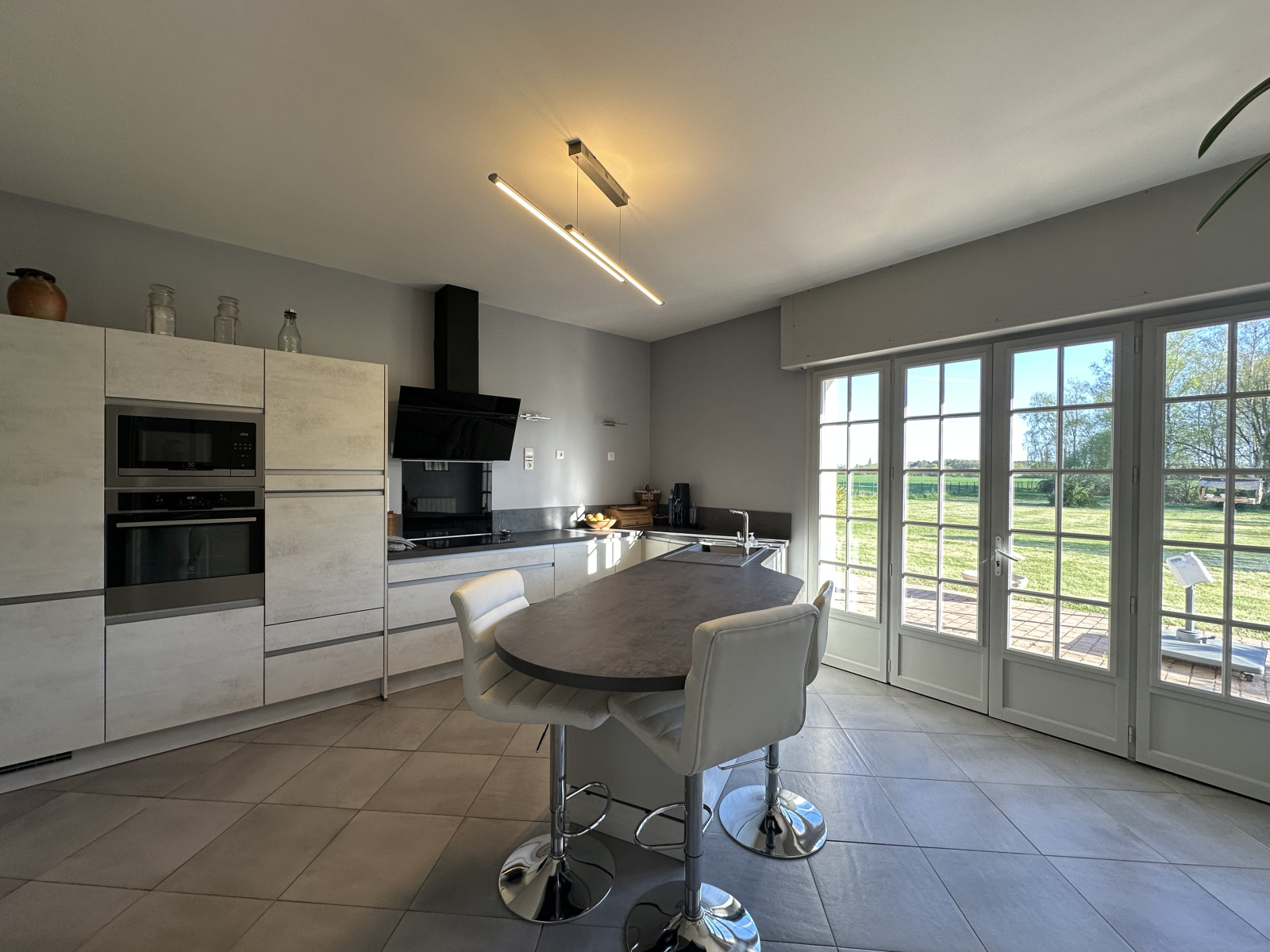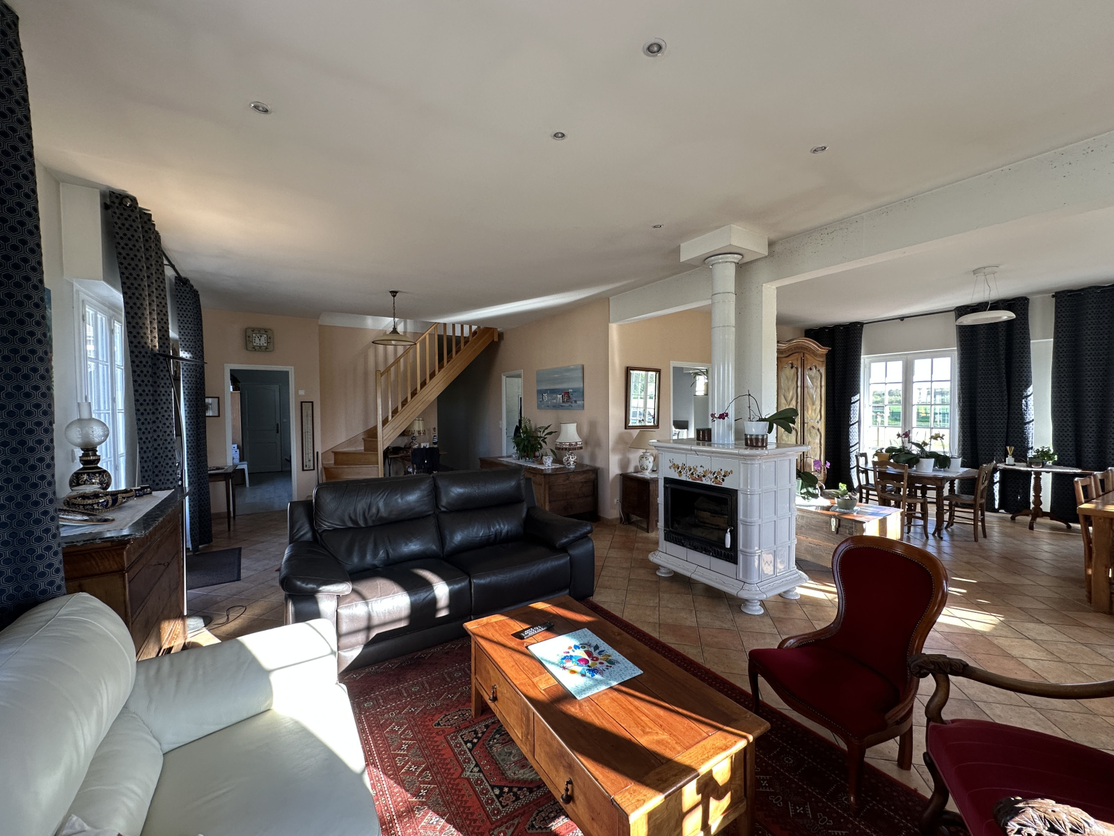 La maison, construite en 1982 puis entièrement transformée en 1998, développe 320 m² habitables. Dès l’entrée, les volumes généreux et la luminosité se révèlent. Le séjour-salon, d’une surface de plus de 60 m², bénéficie d’une triple exposition. Un poêle en céramique trône au cœur de la pièce et apporte une touche chaleureuse à l’ensemble. La cuisine, contemporaine et parfaitement équipée, s’intègre dans une circulation fluide et fonctionnelle. Au rez-de-chaussée, les espaces de nuit comprennent une suite parentale avec grand dressing, une chambre complémentaire, une salle de bains ainsi qu’une buanderie.