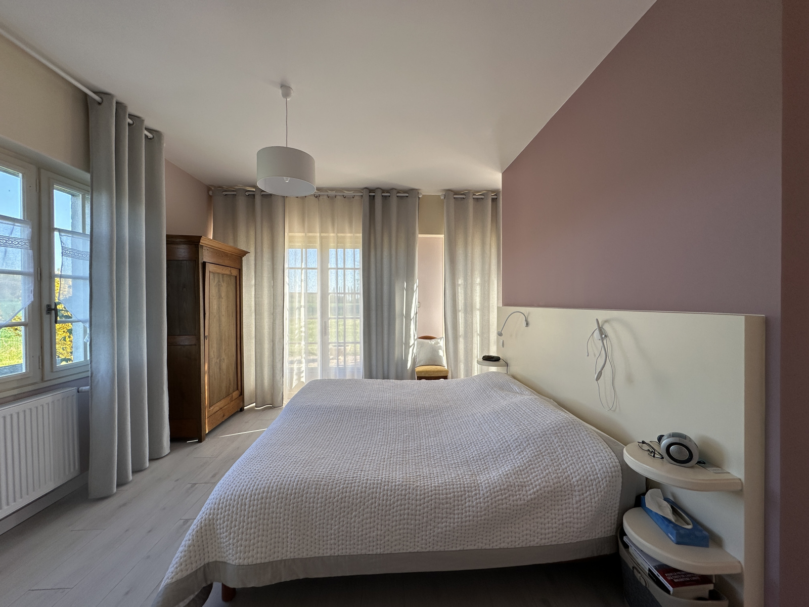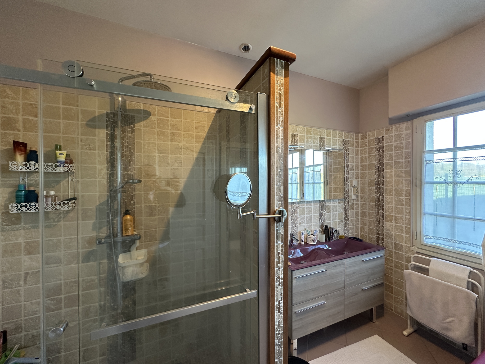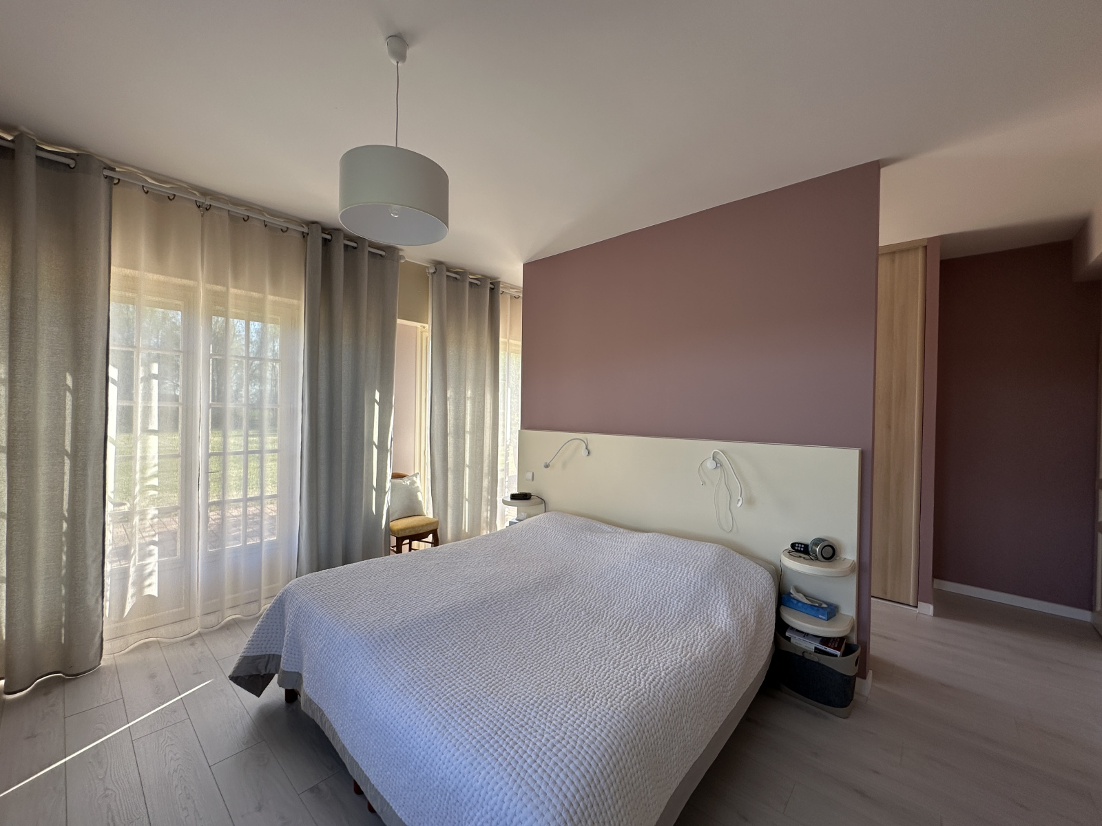 La maison, construite en 1982 puis entièrement transformée en 1998, développe 320 m² habitables. Dès l’entrée, les volumes généreux et la luminosité se révèlent. Le séjour-salon, d’une surface de plus de 60 m², bénéficie d’une triple exposition. Un poêle en céramique trône au cœur de la pièce et apporte une touche chaleureuse à l’ensemble. La cuisine, contemporaine et parfaitement équipée, s’intègre dans une circulation fluide et fonctionnelle. Au rez-de-chaussée, les espaces de nuit comprennent une suite parentale avec grand dressing, une chambre complémentaire, une salle de bains ainsi qu’une buanderie.