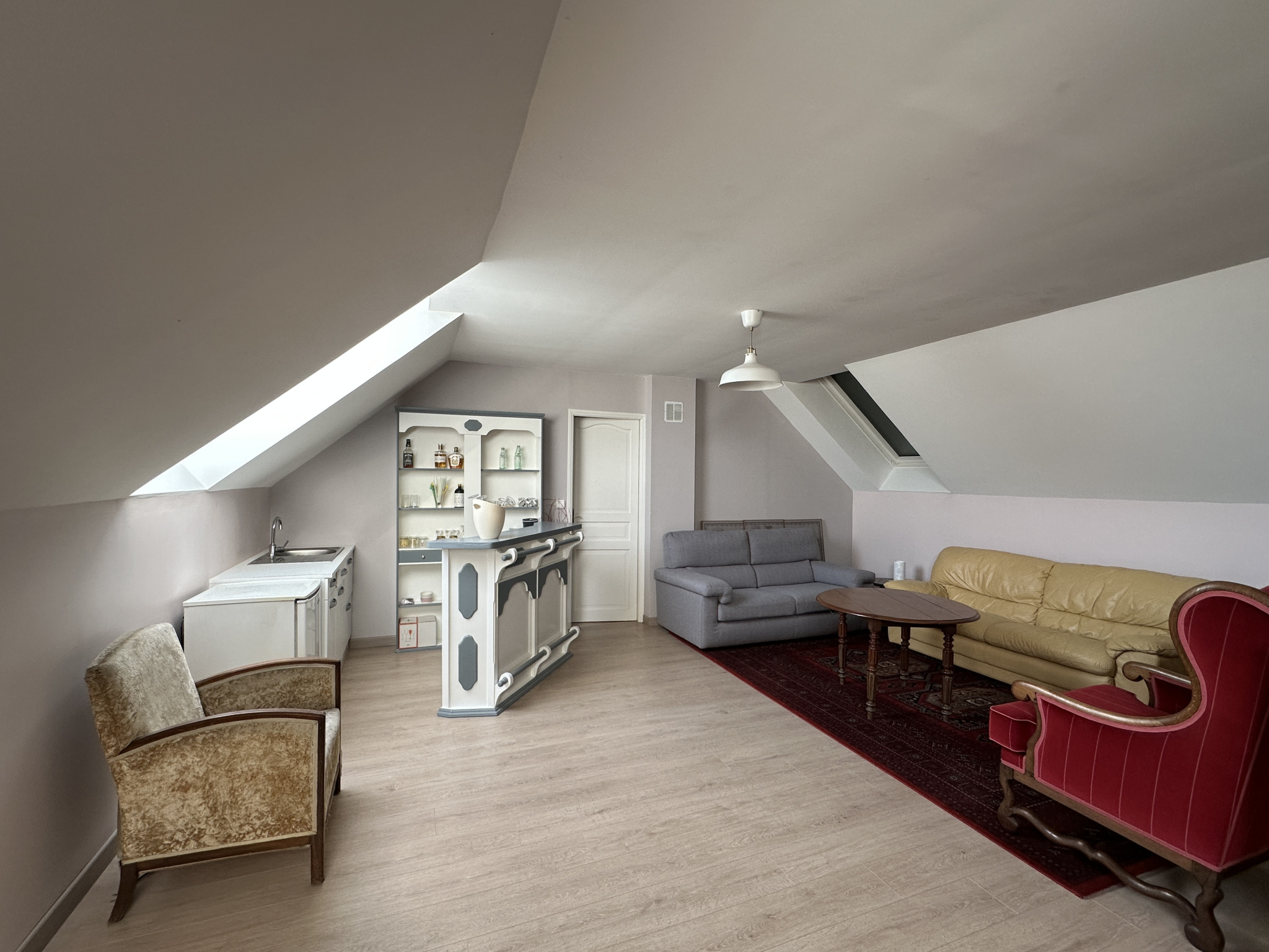 À l’étage, un vaste espace de réception d’environ 40 m² et deux chambres supplémentaires, une salle d’eau et un WC indépendant composent également ce niveau.