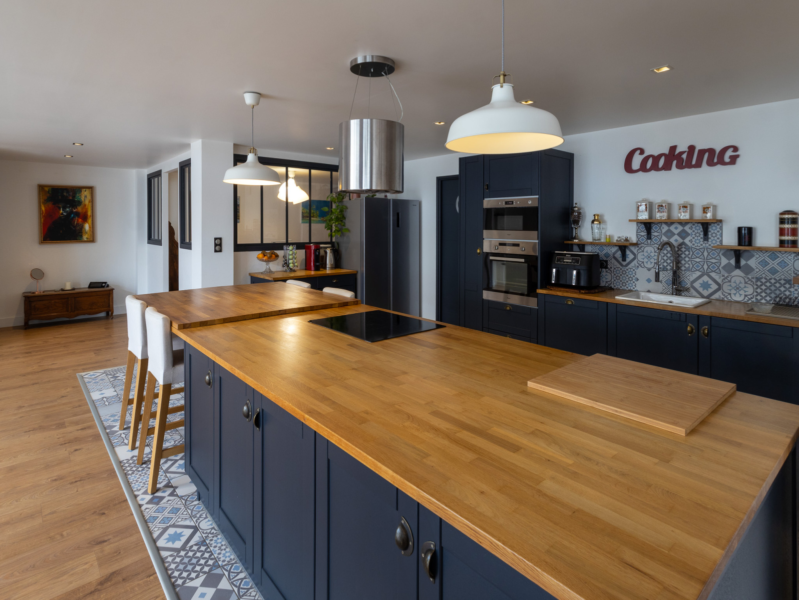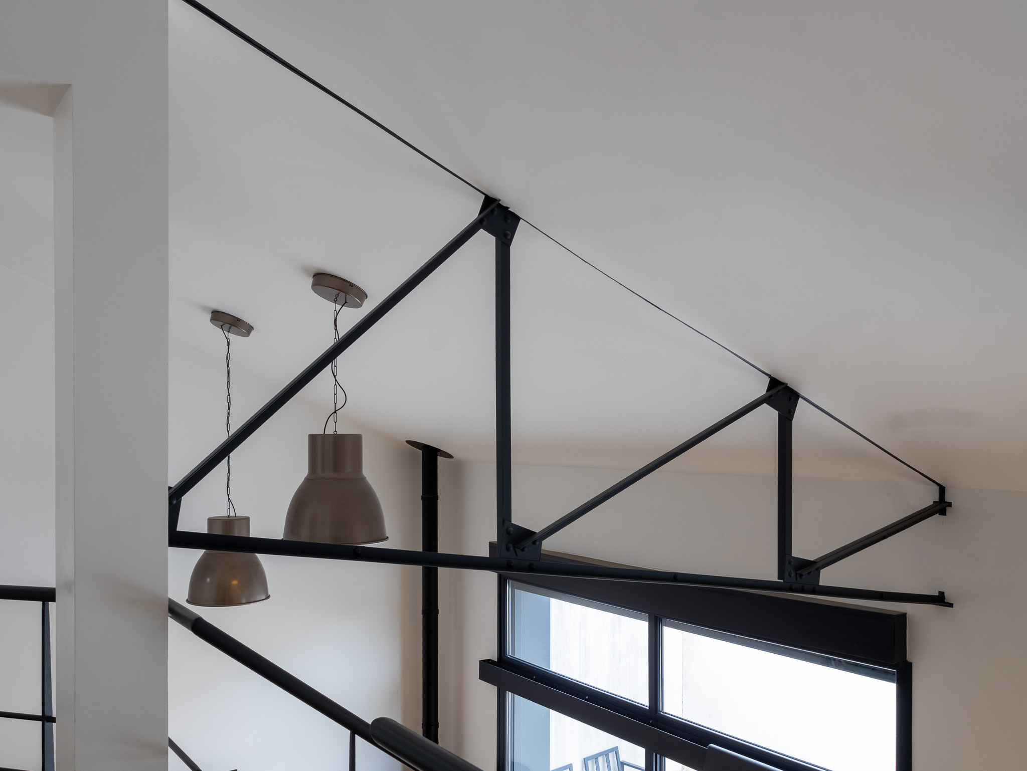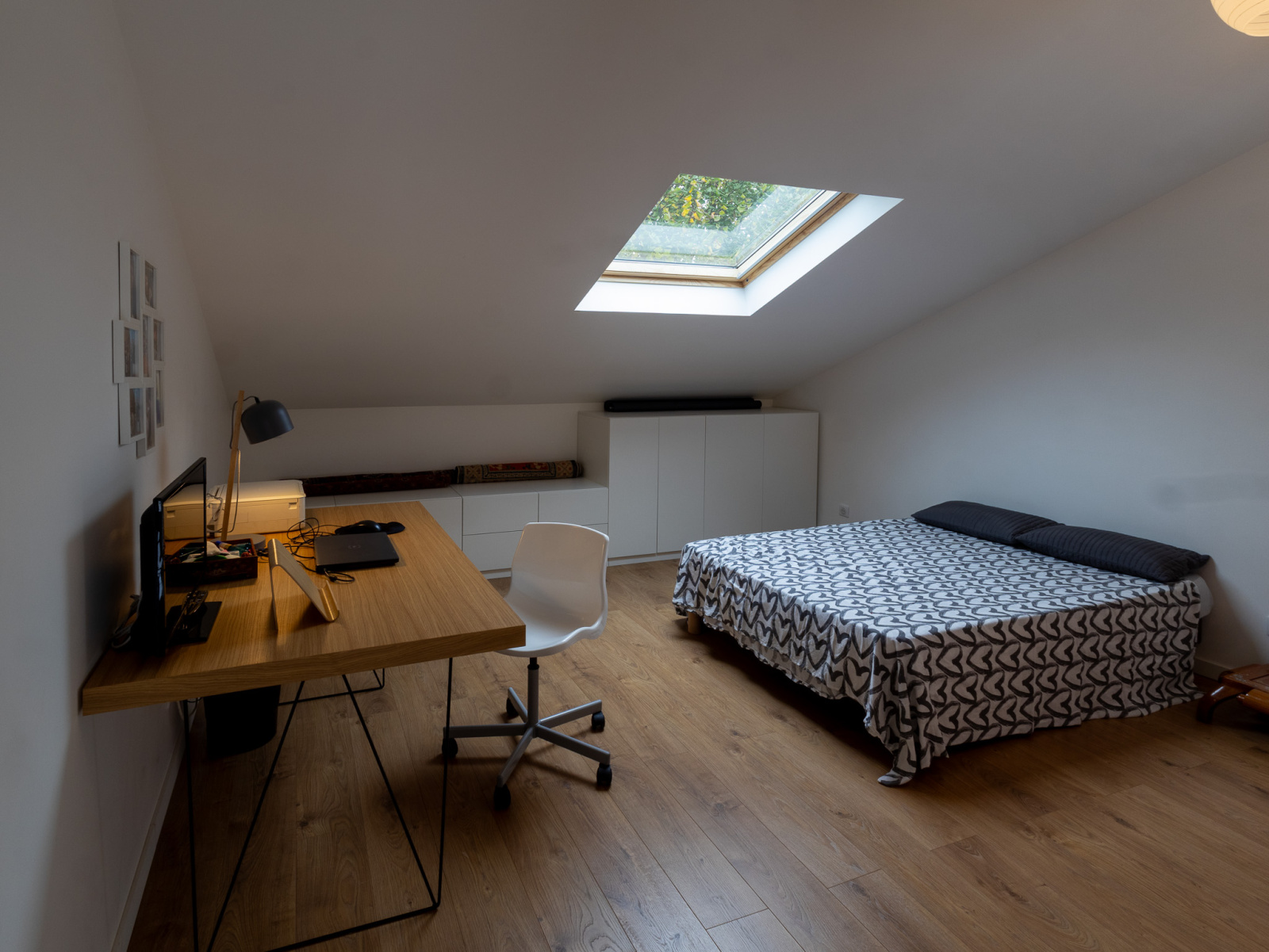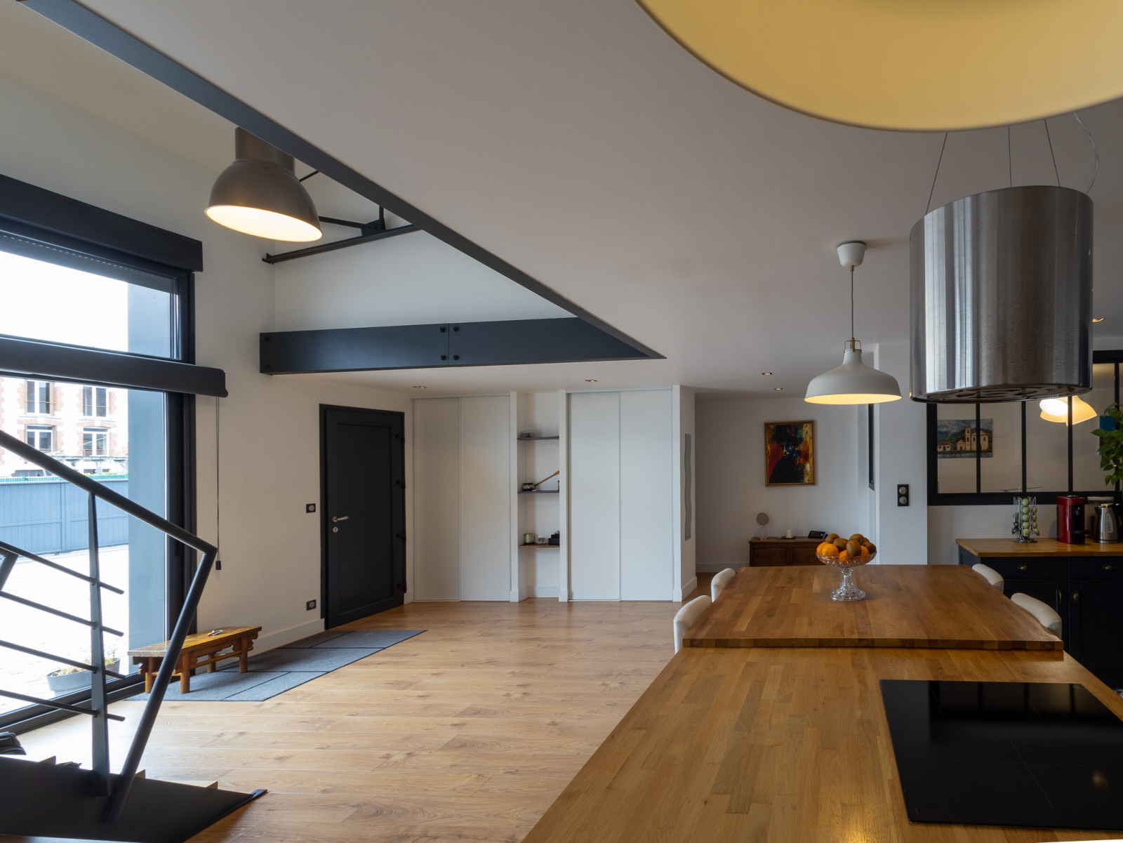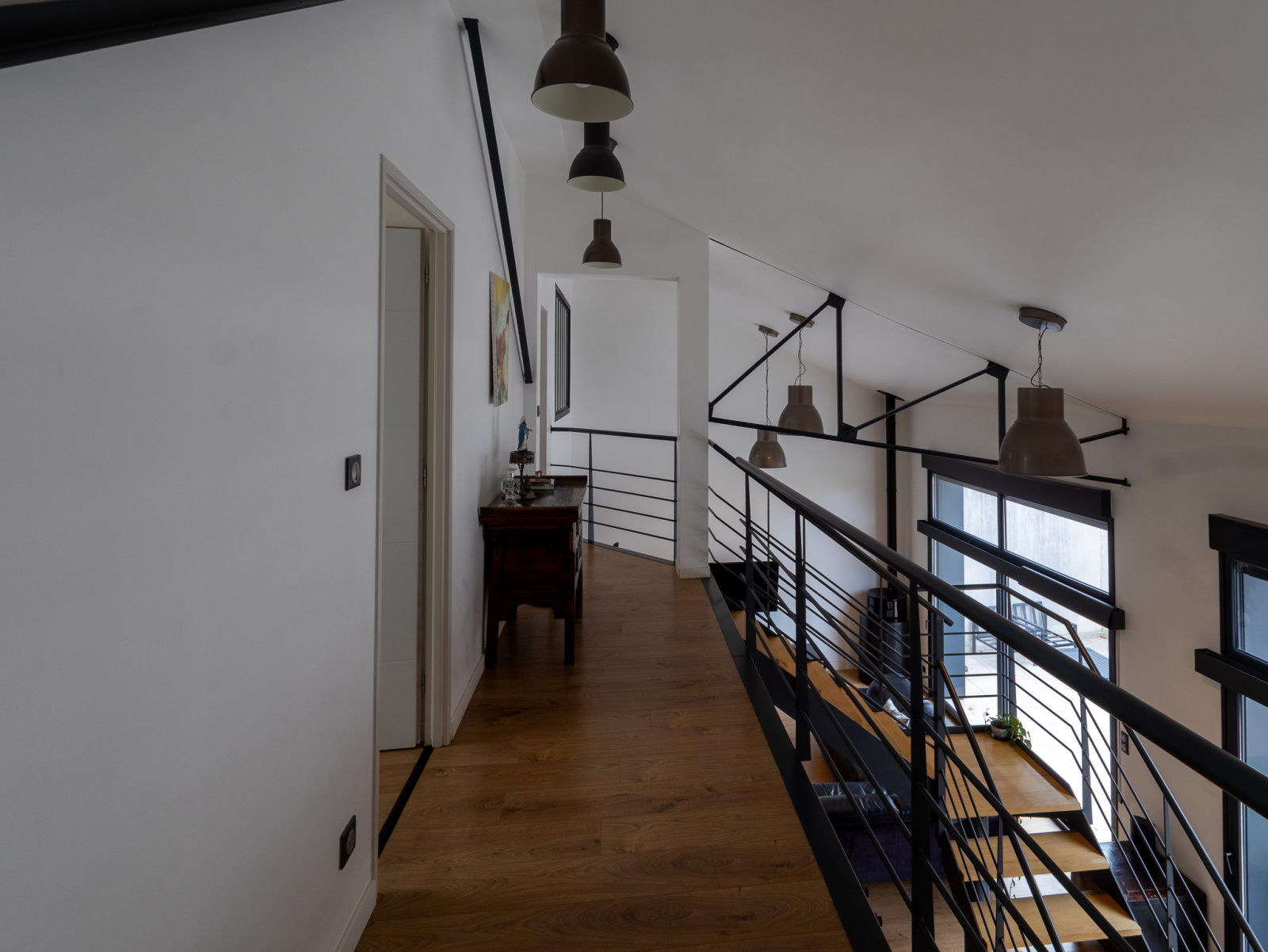 Ce lieu contemporain et baigné de lumière revisite complètements les codes habituels de l'habitat. Les volumes respectent l'esprit attentu d'un tel endroit. Baies vitrées, hauteur sous plafond, spacieuse cuisine équipée ouverte sur le séjour salon ne faisant qu'un seul volume de près de 80 m². Un espace bureau ou chambre au RDC s'ouvre à ce grand espace de vie par des verrières de type atelier. Le premier étage est accessible depuis une passerelle. Tous les matériaux sont beaux et nobles. Acier, Bois massif, parquets.