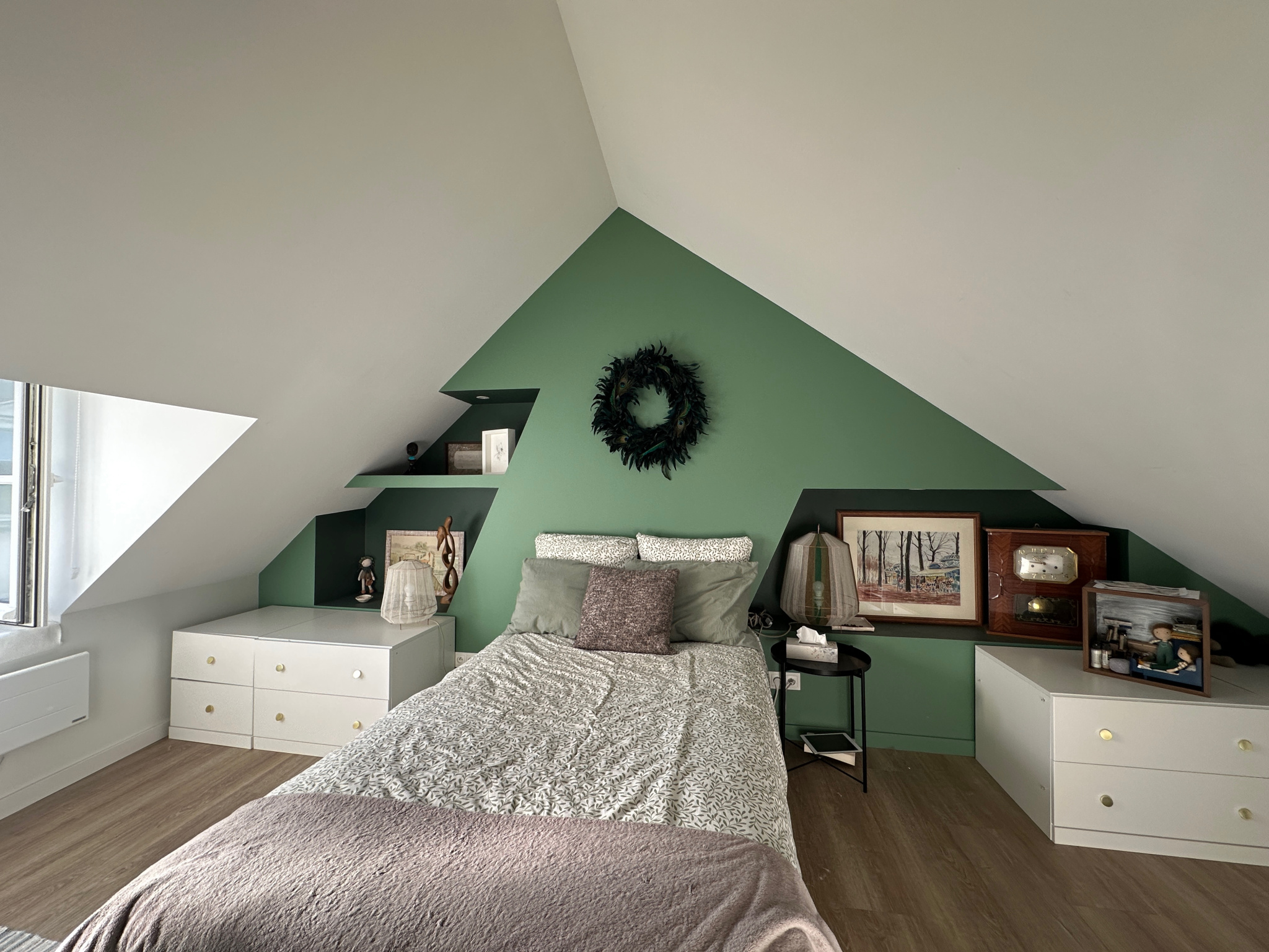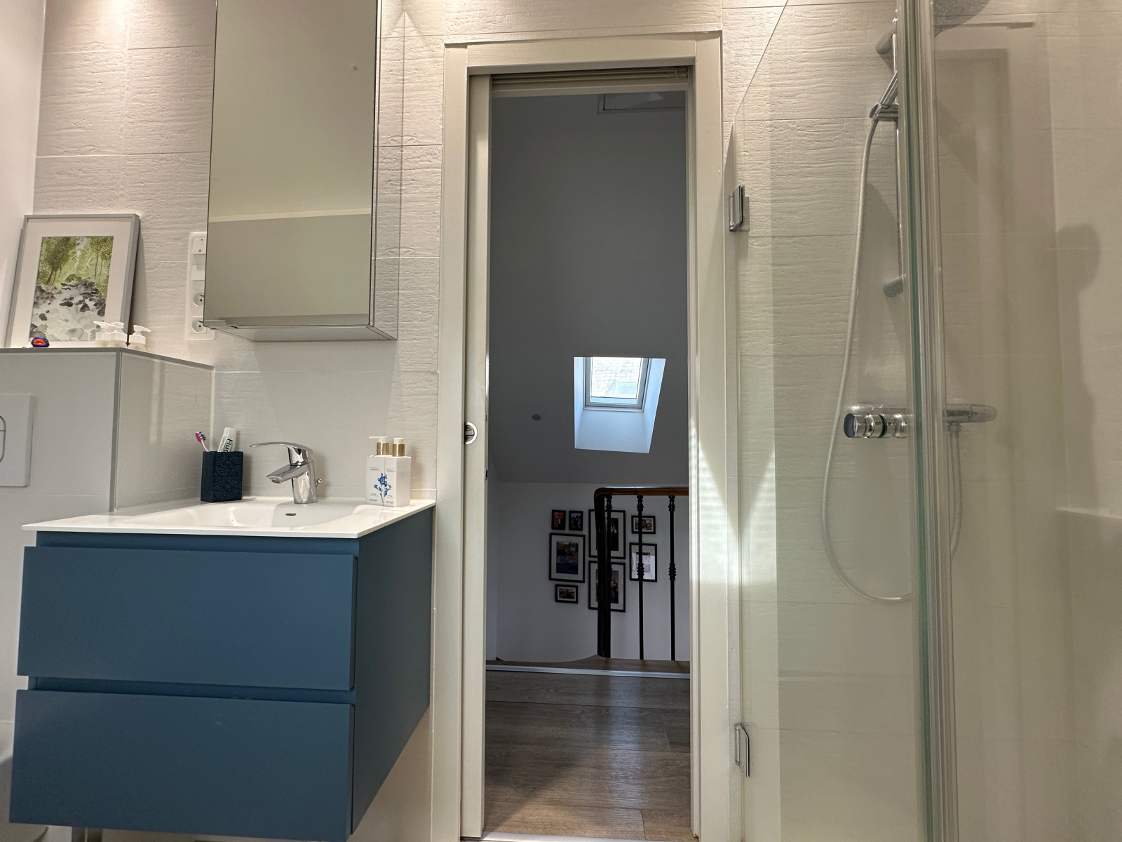 Au RDC, l'entrée dessert d'une part une grande chambre au RDC avec une salle de bain attenante et d'autre part un bureau et une buanderie avec l'accès au jardin clos cosy.