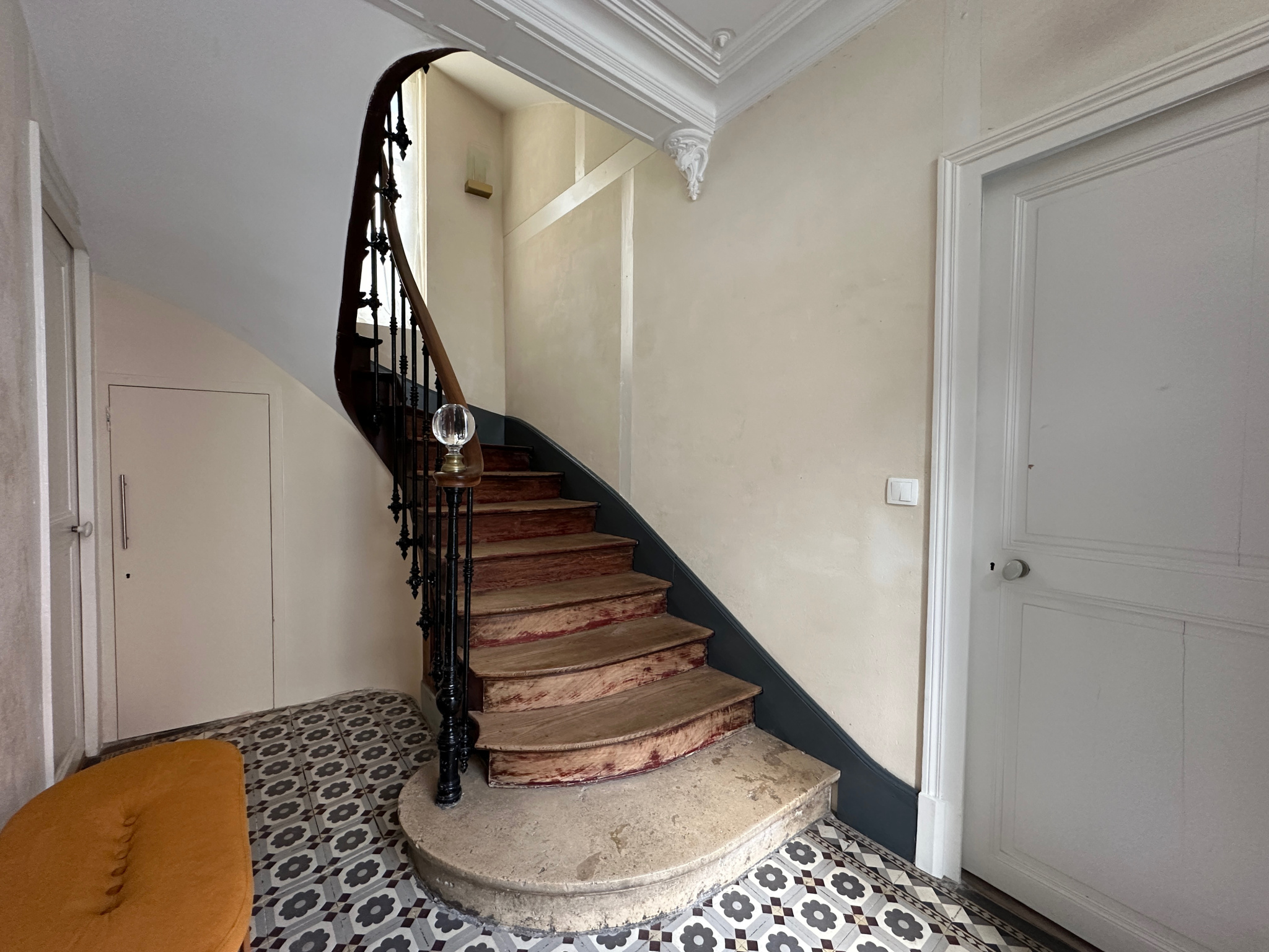 De beaux matériaux composent cette maison tels que l'escalier ancien, la cheminée en marbre, les carreaux de ciment et la charpente apparente.