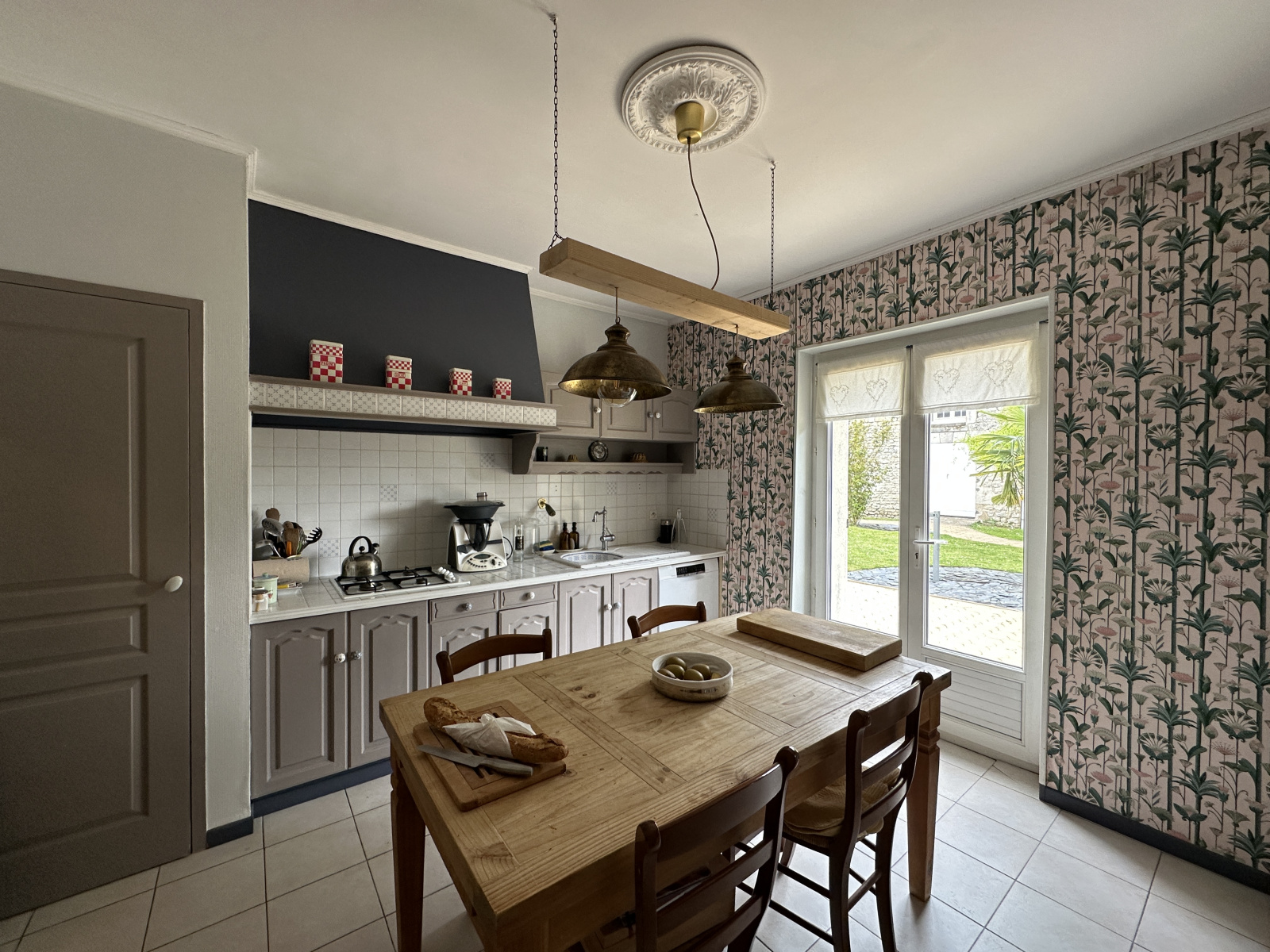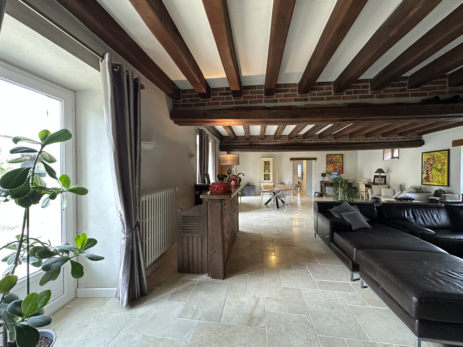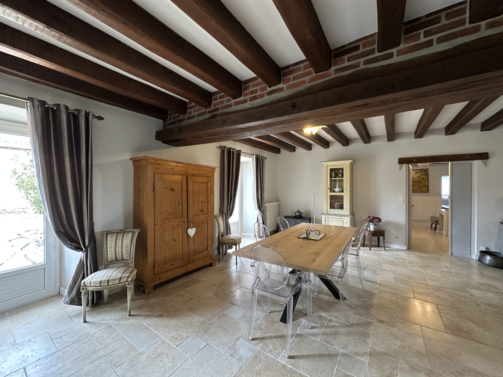 À l’intérieur, la maison a été restaurée dans les règles de l’art, avec des matériaux de qualité et une attention portée à la fonctionnalité comme à l’esthétique. Le rez-de-chaussée s’ouvre sur une vaste entrée qui dessert un séjour-salon lumineux de 80 m² avec cheminée, une cuisine indépendante entièrement équipée, trois chambres, une salle de bain, une grande buanderie, la chaufferie et une grange permettant de stationner deux véhicules.