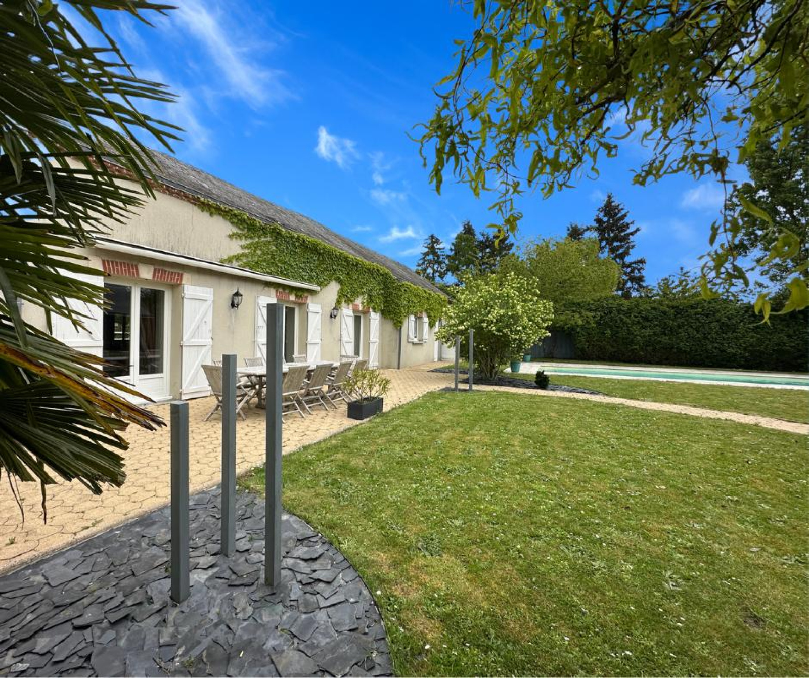 Implantée sur un terrain arboré de 3 121 m² entièrement clos, la maison principale, de style longère, s’organise en L autour d’un magnifique jardin fleuri, d’une grande terrasse et d’une piscine chauffée récente (11 x 4 m), avec pool house. L’ensemble forme un cadre de vie harmonieux, à la fois structuré et apaisant, idéal pour une vie de famille, une résidence secondaire ou un projet d’accueil.