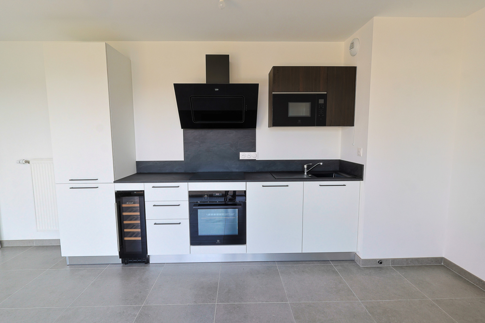 - Cuisine moderne entièrement aménagée et équipée (plaque, hotte, frigo avec micro-ondes intégré, lave-vaisselle et cave à vin), ouverte sur un séjour lumineux