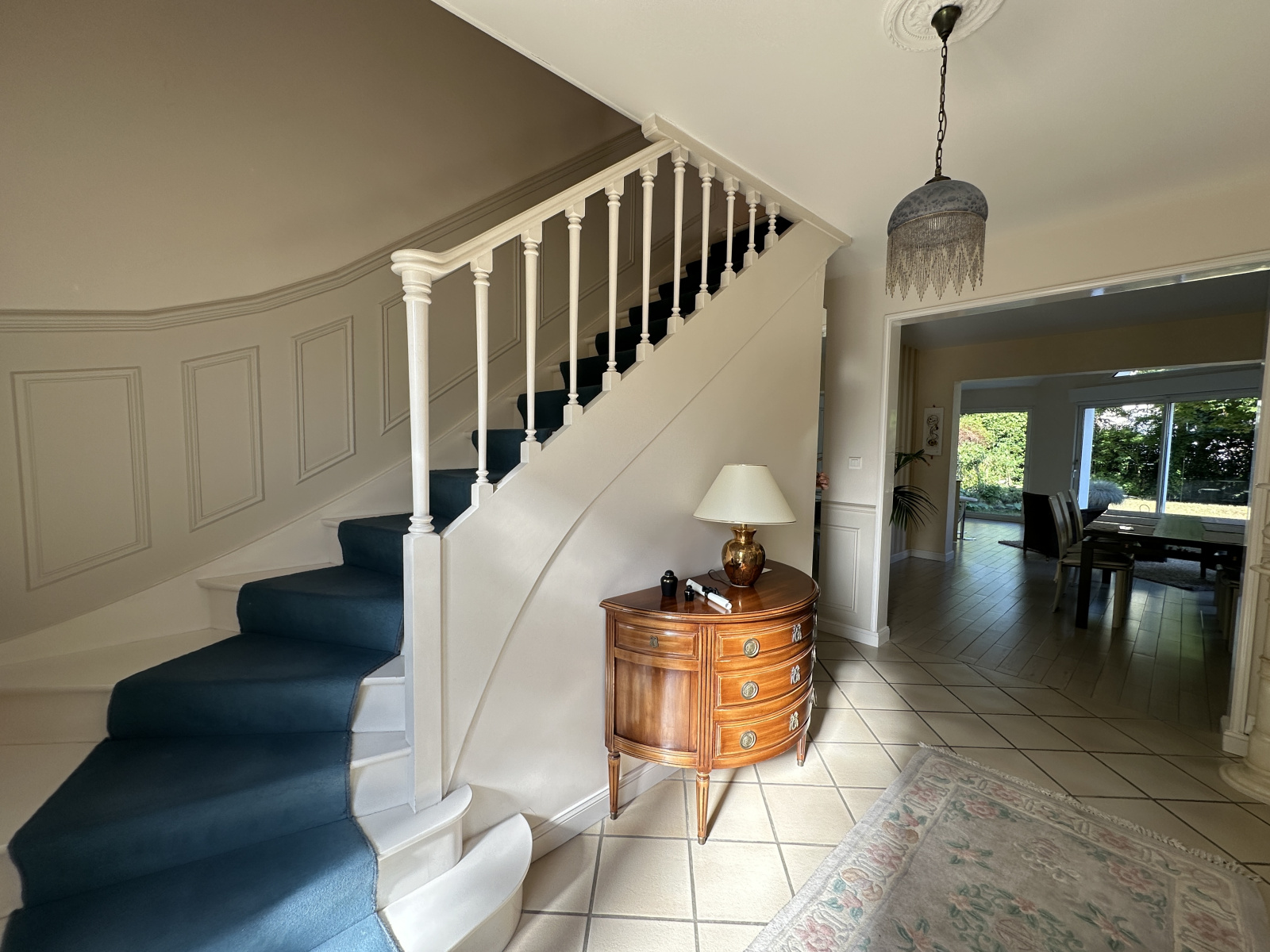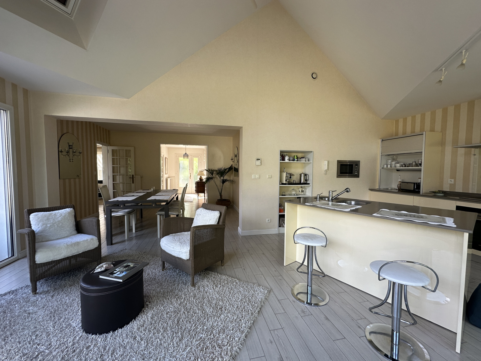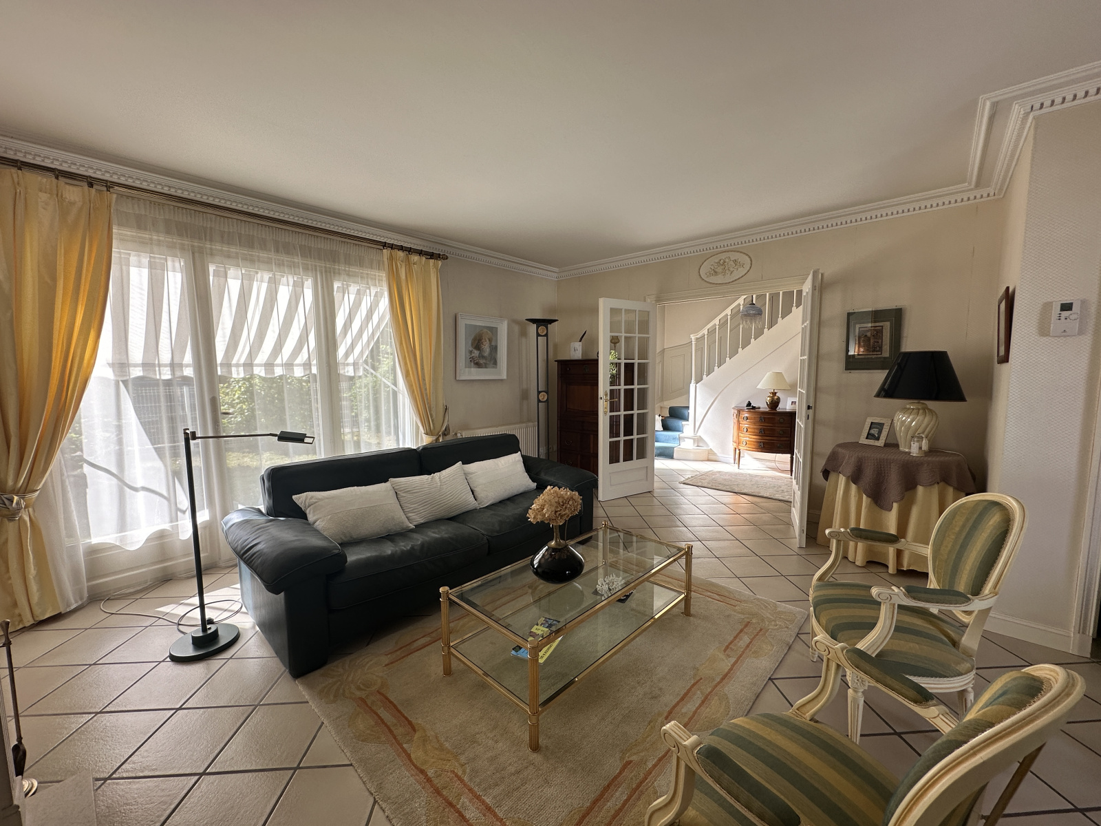 Au RDC l'entrée s'ouvre vers le séjour et la cuisine équipée orientée vers le jardin, le salon traversant ainsi que l'espace nuit du RDC (avec SDE récente).