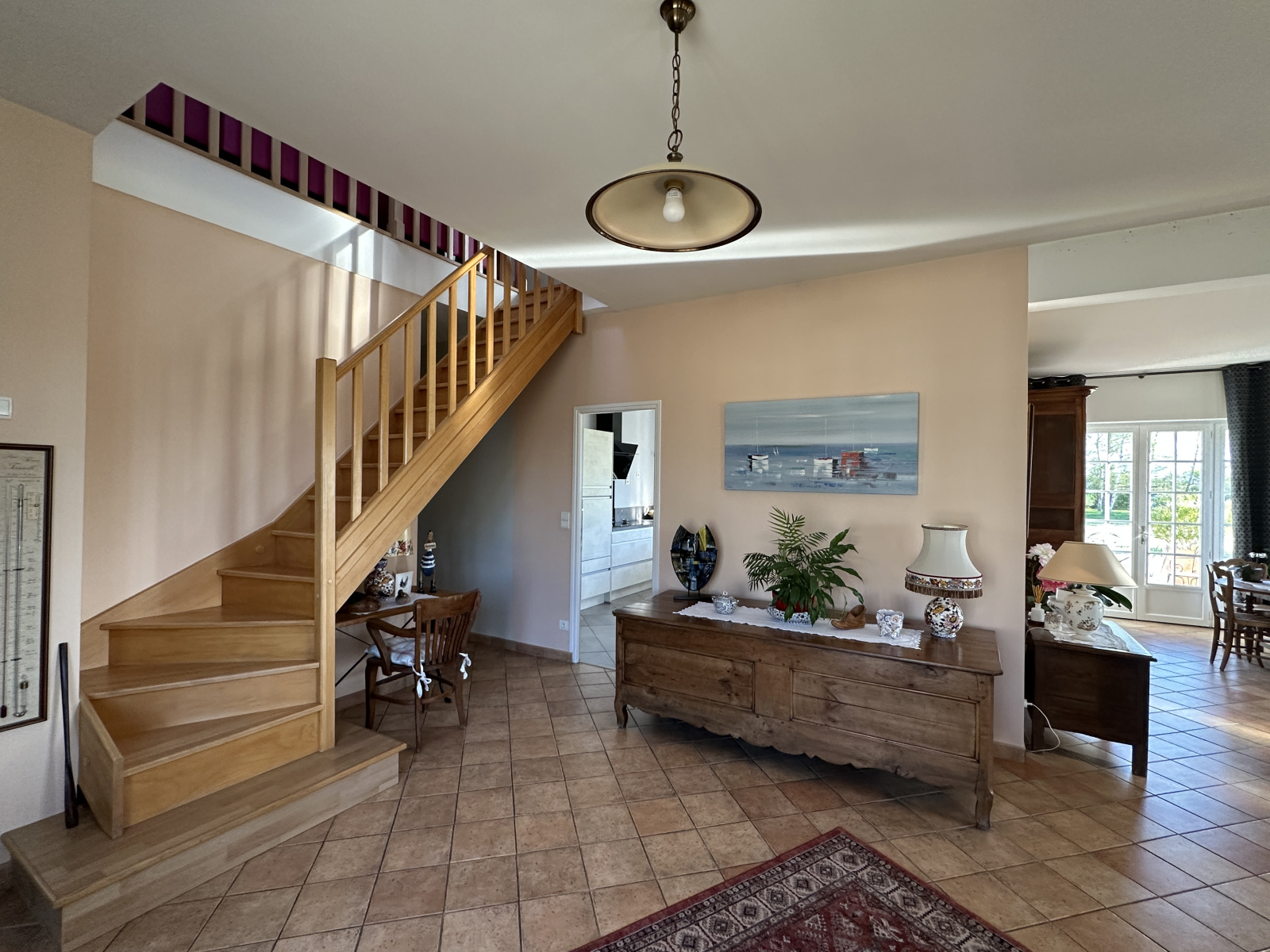 À l’étage, un vaste espace de réception d’environ 40 m² prolonge la convivialité avec un coin bar intégré. Deux chambres supplémentaires, une salle d’eau et un WC indépendant composent également ce niveau.